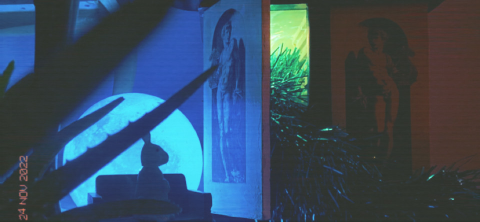 Digitaalista runoutta, valoja ja pintoja sisältävä Kajastaja-installaatio, Kumpulan kylätila, 2023, yhdessä Sanna Pelliccionin kanssa.