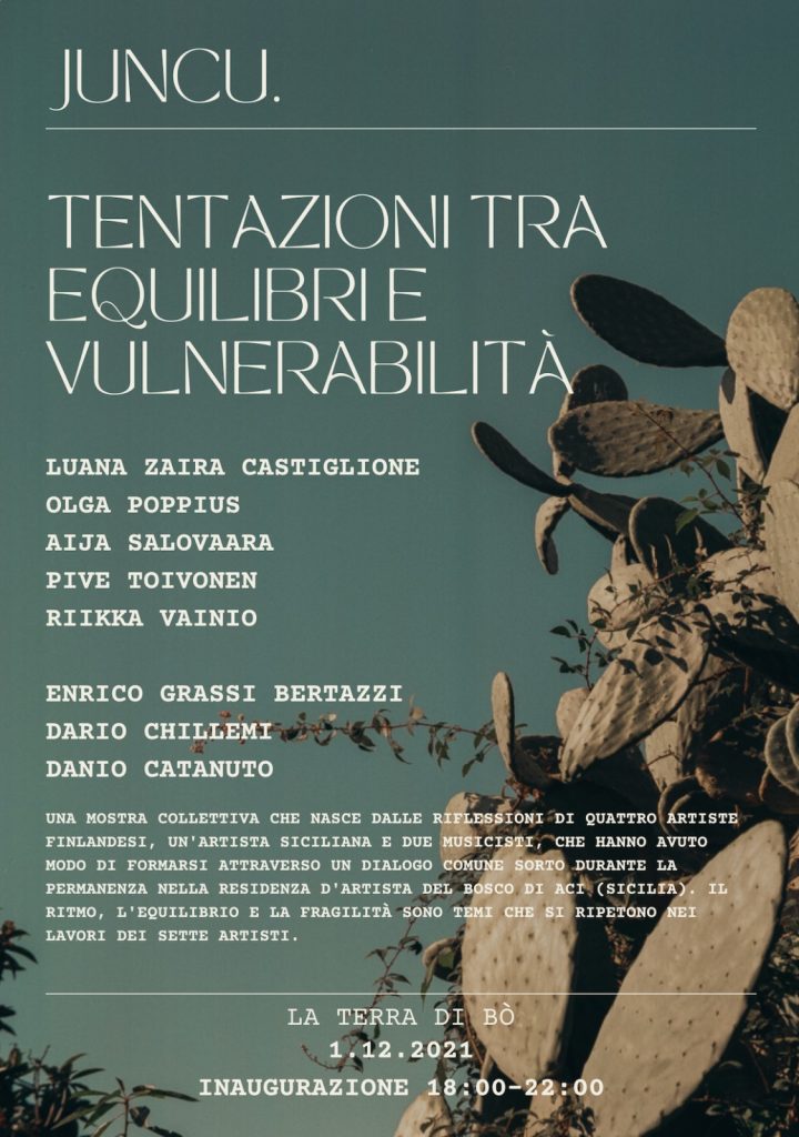 Sanataidetta, kuvataidetta ja valokuvaa sisältävä näyttely Juncu, Tentazioni tra equilibri e vulnerabilitá, Terra di Bón galleriatila, Catanian maakunta, Italia, 2021, yhteistyössä Riikka Vainion, Olga Poppiuksen, Pive Toivosen ja Luana Zaira Castiglionen kanssa.
